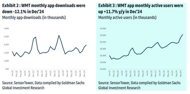 Goldman's Kate McShane, Emily Ghosh, and others cited Sensor Tower data that showed while Walmart's mobile app download growth slowed in December, active user engagement surged the most in years: