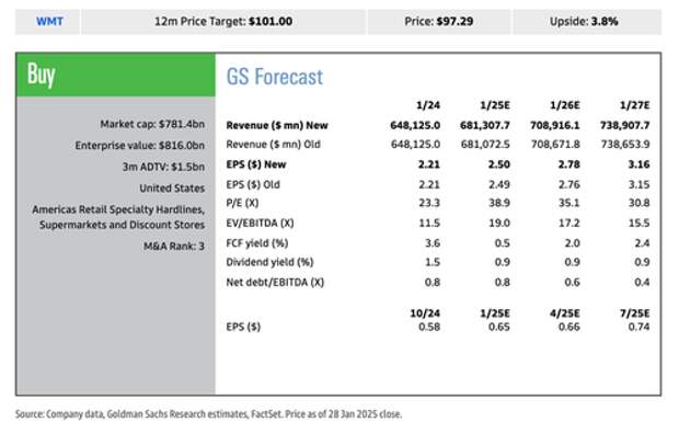 20:We believe WMT is well positioned to continue driving solid earnings growth into 2025, supported by market share gains given its compelling proposition for value and convenience while its profitability profile should also improve, noting that operating income outpaced sales in 3Q. We reiterate our Buy rating for WMT with a price target of $101.