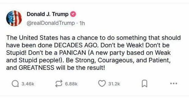 ""The United States has a chance to do something that should have been done DECADES AGO. Don’t be Weak! Don’t be Stupid! Don’t be a PANICAN (A new party based on Weak and Stupid people!). Be Strong, Courageous, and Patient, and GREATNESS will be the result!" Trump posted Monday morning on Truth Social about 15 minutes before cash open on US exchanges.