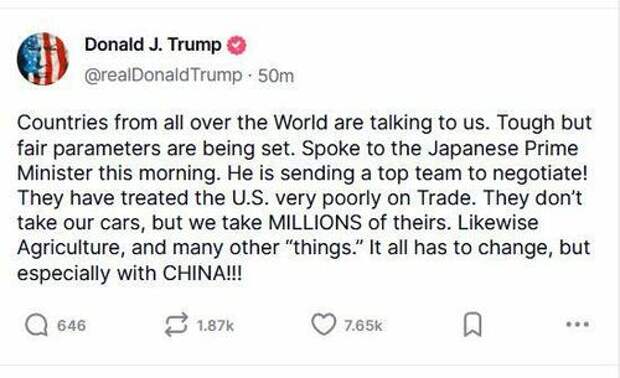 "Spoke to the Japanese Prime Minister this morning. He is sending a top team to negotiate! They have treated the U.S. very poorly on Trade. They don’t take our cars, but we take MILLIONS of theirs. Likewise Agriculture, and many other “things.” It all has to change, but especially with CHINA!!!"
