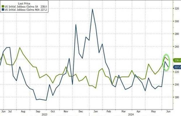 .. and they were right with initial claims falling from 243k (revised up) to 238k (worse than the 235k exp)...Source: Bloomberg