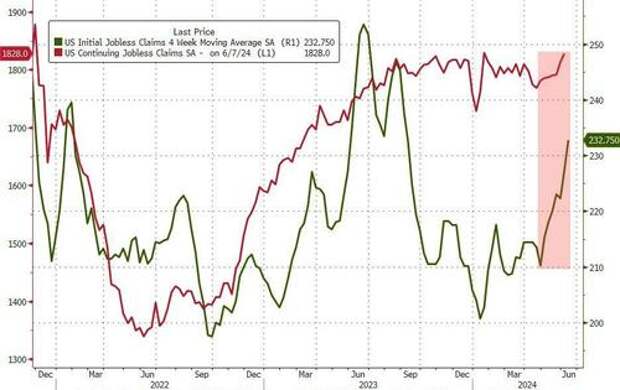 Continuing claims rose once again, holding above the $1.8mm Maginot Line and back near the highest since Nov 2021. The trend (4wk ma) in initial claims is clear though...