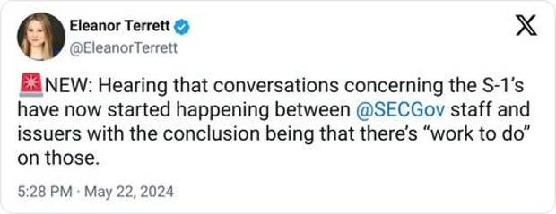 Journalist Eleanor Terrett noted that discussions between SEC staff and Ether ETF issuers about the S-1 forms concluded with the understanding that there was still “work to do.”