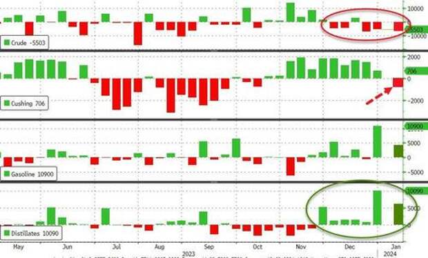 Another large crude draw along with major product builds in the week-ending Jan 5th... and stocks at Cushing fell for the first time since October...