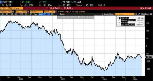 - The spread between the 1-year US Treasury bill and the 10-year US Treasury note was 97.9 basis points (0.98 percent) in mid-January 2021. That spread inverted in mid-2022, about the time that headline CPI year-over-year actually reached 9.1 percent. A normal yield curve slopes upward, with a positive spread showing that longer-term bonds yield more than shorter-term ones, typically reflecting expectations of economic growth and rising future interest rates. An inverted yield curve slopes downward with a negative spread as shorter-term bonds yield more than longer-term ones. Those conditions are often considered a predictor of an economic recession. As of May 2024, the 1-to-10 year spread has been negative for over 600 days.