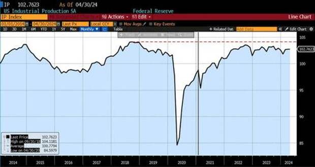 - The Federal Reserve’s Industrial Production (IP) Index was at 98.8 in January 2021. Owing to lockdowns and other pandemic policies, the index plummeted to a low of 84.6 in April 2020 and was recovering early in 2021. But despite hitting a post-pandemic high of 103.5 in September 2022, the IP Index hasn’t yet recovered its September 2018 all-time high of 104.1. Since the start of 2024, the index has declined, currently oscillating between 101.8 and 102.8.
