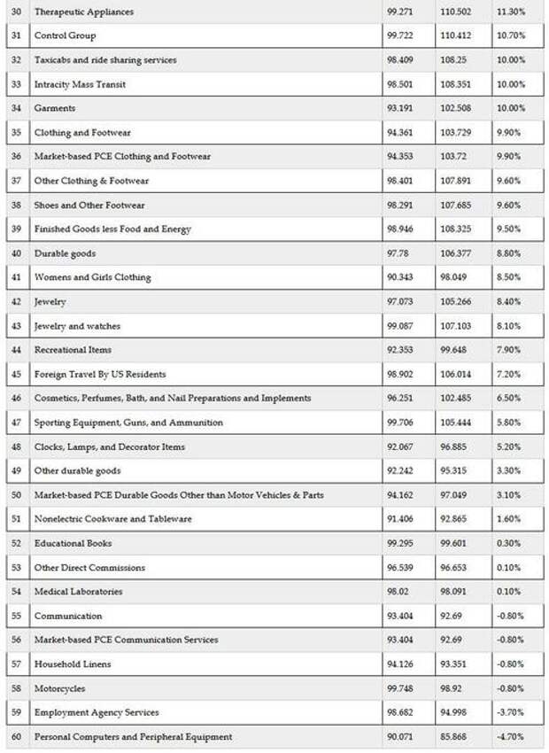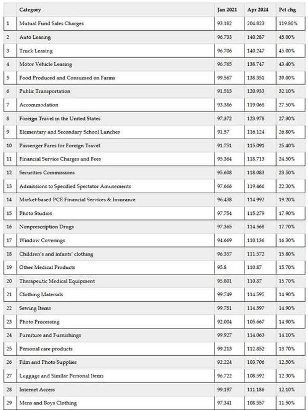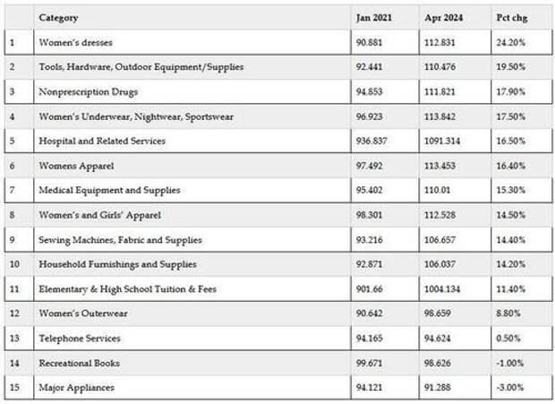 - In January 2021, fifteen subindices of CPI began with the number nine. Their levels in that month, in the April 2024 report, and the percent change are shown below.