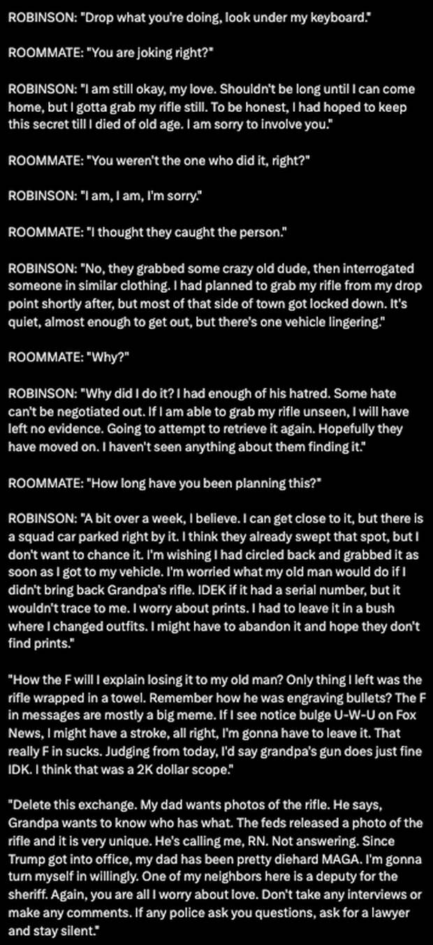 Benny Johnson released the Utah County DA's full text message exchange between Robinson and his transgender boyfriend/roommate after committing the assassination: