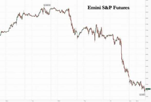 US equity futures and global markets tumbled on the last day of the worst quarter for US stocks in 23 years as the April 2 "liberation day" comes into sharp view. As of 8:00a, S&P futures are down 1.1% after Trump dented hopes he would limit the initial scope of levies set to be unveiled on Wednesday, telling reporters aboard Air Force One he plans to start with “all countries" leading to Goldman promptly slashing its S&P price target for the second time in weeks, now seeing the index dropping to 5300 in 3 months; Nasdaq futures tumbled 1.
