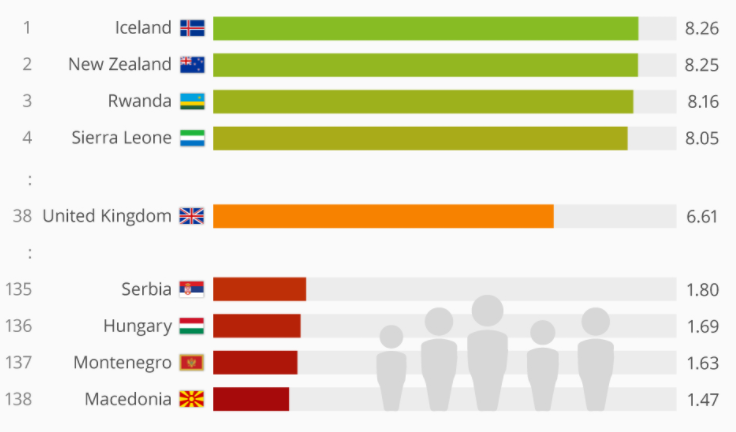 Iceland was at the opposite end of the scale, scoring 8. 26 out of 9.0. It was followed by New Zealand and Rwanda.