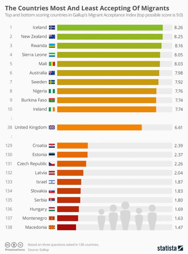 Statista's Nial McCarthy notes that the research found that Macedonia, Montenegro, Hungary, Serbia, Slovakia and Croatia which are all along the Balkan route for asylum seekers recorded the lowest scores for accepting migrants.