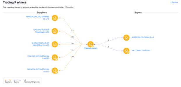 Public trade data compiled by counterparty and supply chain risk intelligence firm Sayari shows Forever 21's suppliers reside mainly in China.