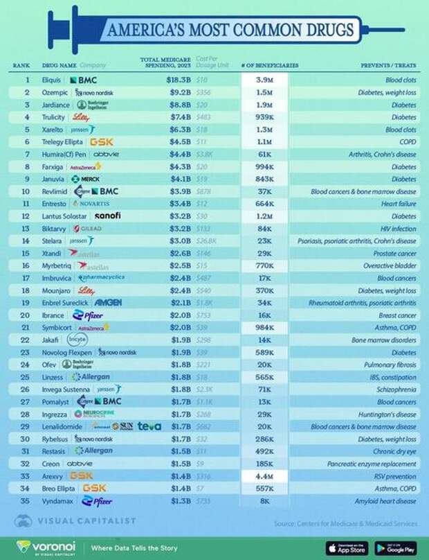Eliquis (generic name: Apixaban) alone racked up $18.3 billion in Medicare spending in 2023, nearly double the next drug, Ozempic.