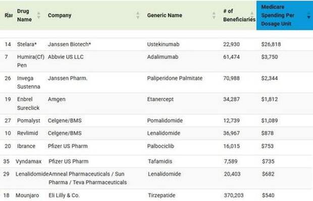 Revlimid, Humira, and Stelara each exceed $3 billion despite treating fewer than 100,000 beneficiaries each.