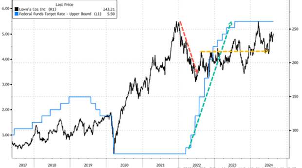 In markets, LOW shares are marginally lower in premarket trading in New York. What's important to note about the few years of sideways price action is that it stems from the Federal Reserve's interest rate hiking cycle, which lifted off in early 2022. High interest rates and elevated inflation have pressured low/mid-tier consumers, forcing many to pull back on discretionary spending.