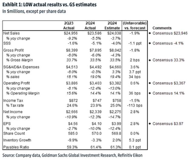 LOW reported 2Q24 adj. EPS of $4.10, above the GS and consensus (Refinitiv) estimates of $3.99/$3.97. Adj results excludes a pre-tax gain associated with the 2022 sale of the Canadian retail business. Net sales decreased 5.5% y/y to $23.586bn, below the GS estimate of $24.038bn and consensus of $23.946bn, while comparable sales decreased 5.1% y/y vs. the GS estimate of -4.0% and consensus of -4.1%. Operating margin decreased 114 bps y/y to 14.4% (vs. GS/consensus of 14.1%/14.1%) as operating expenses (SG&A and D&A) as a % of sales increased 96 bps y/y to 19.0% while gross margin decreased 18 bps y/y to 33.5%.