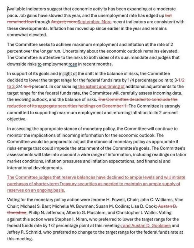The Fed said reserve balances have declined to ample levels and will use shorter-term Treasury purchases when needed to maintain sufficient reserves. October's balance-sheet guidance, "the Committee decided to conclude the reduction of its aggregate securities holdings on December 1" is removed; instead, December adds new guidance: “the Committee judges that reserve balances have declined to ample levels and will initiate purchases of shorter-term Treasury securities as needed to maintain an ample supply of reserves."