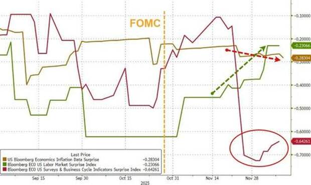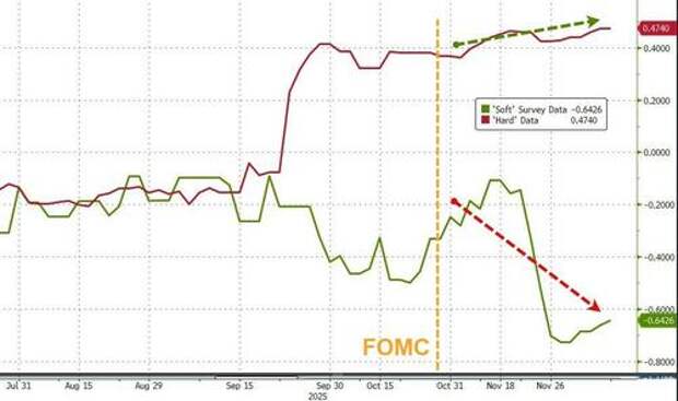 Since the last FOMC meeting (on October 29th), The Fed has largely been flying blind from a macro data perspective (thanks to the government shutdown) with the sporadic 'hard' data outperforming while 'soft' data has shit the bed and alternative labor market insights remain mixed at best (and extremely lagged at worst)...