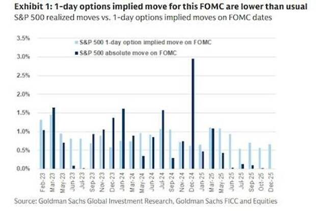 On average, the S&P 500 has moved +/-0.6% during the last 8 FOMC meetings with realized moves coming lower than expectations during all events except the December FOMC (hawkish cut) which saw an outsized move (-2.9%) relative to unusually low expectations (+/-0.7%).