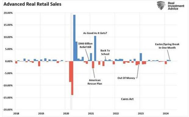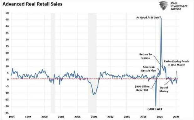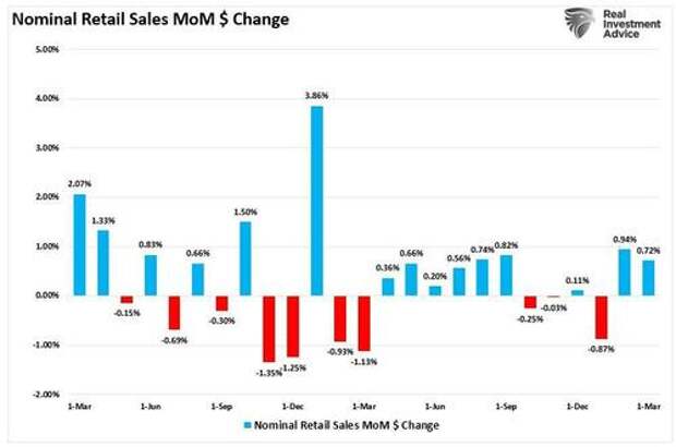 First, retail sales data was extraordinarily weak from October to January, the traditionally strongest shopping months of the year. That period included Halloween, Thanksgiving, Christmas, and NYear’sr’s. So, to some degree, the strength of spending over the last two months is unsurprising as, eventually, consumers need to buy goods or services previously postponed.