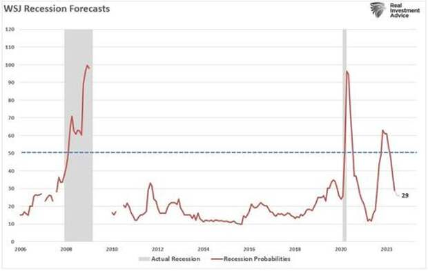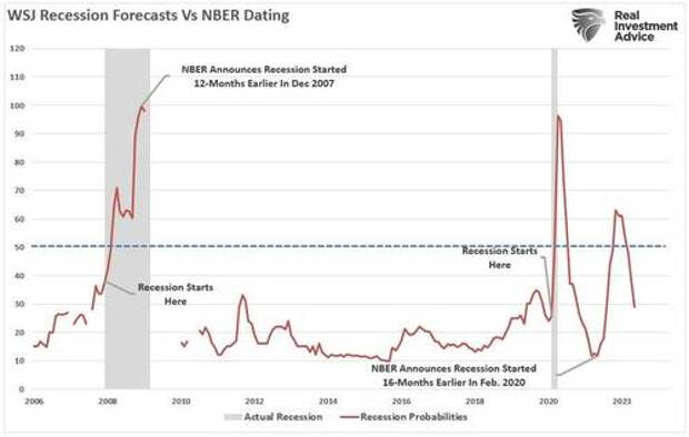 Crucially, I am not saying a recession is starting next month. However, I suggest that relying heavily on one month’s retail sales data to claim the economy avoided a recession is not likely ideal. Let’s revisit that chart of the WSJ economic forecast. I have added two notations: the start and end of recessions and when the NBER officially dated that period. As shown in both previous recessions, WSJ economists had a very low probability of the economy entering a recession just before it occurred.
