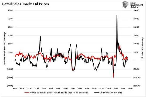 Secondly, while the March retail sales data was strong, it was weaker than February. However, March contained two significant spending periods, Spring Break and Easter, which generally don’t occur. Since Spring Break and Easter are considerable travel and shopping periods, it is unsurprising that the retail sales data increased with oil prices rising. As shown below, there is a very high correlation between nominal retail sales and oil prices.