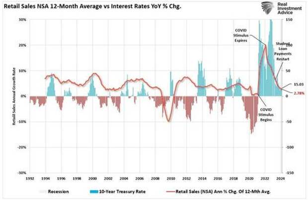 Lastly, consumer credit supporting retail sales will become more problematic with rising interest rates. Higher interest rates tend to reduce the average growth rate of retail sales data.