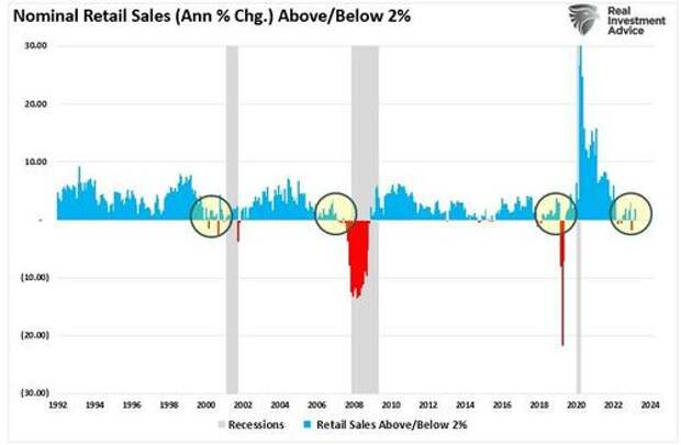 The reality is that on an inflation-adjusted basis, the retail sales data suggests the consumer remains weak. While spending more to buy the same amount of goods or services may look good on paper, the average household has less money to spend elsewhere. As shown, the annual rate of change in real retail sales is near some of the lowest levels outside of a recession.