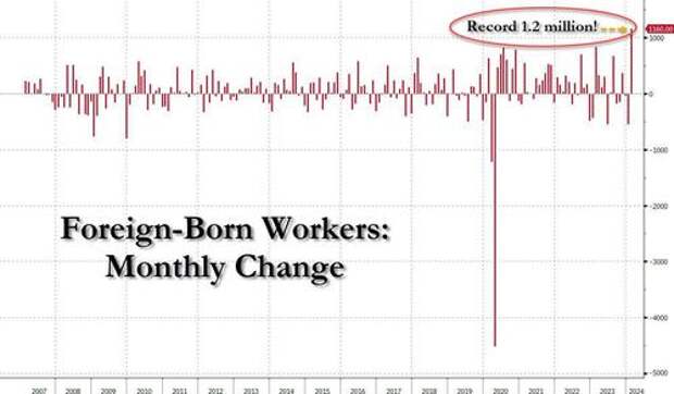 The offset? A record 1.2 million foreign-born (read immigrants, both legal and illegal but mostly illegal) workers added in February!
