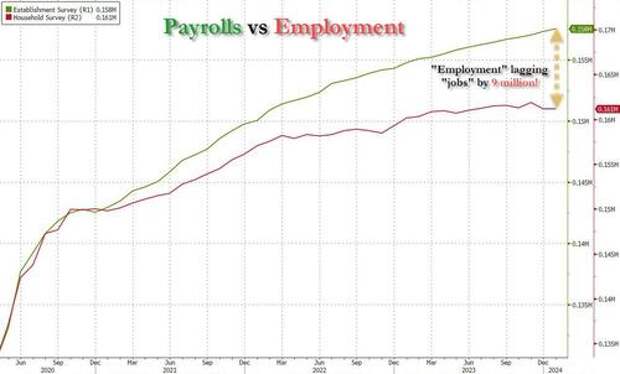 But it's more than just the Biden admin hanging its "success" on seasonal adjustments: when one digs deeper inside the jobs report, all sorts of ugly things emerge... such as the growing unprecedented divergence between the Establishment (payrolls) survey and much more accurate Household (actual employment) survey. To wit, while in January the BLS claims 275K payrolls were added, the Household survey found that the number of actually employed workers dropped for the third straight month (and 4 in the past 5), this time by 184K (from 161.152K to 160.968K).