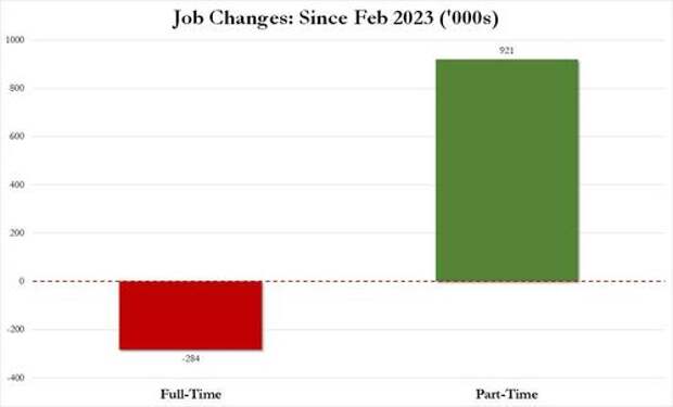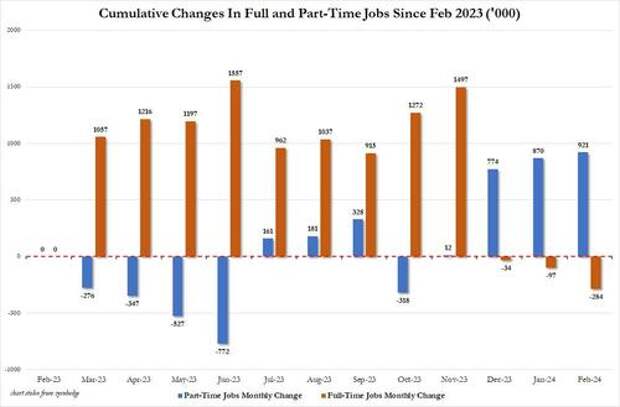 There's more: shifting from a quantitative to a qualitative assessment, reveals just how ugly the composition of "new jobs" has been. Consider this: the BLS reports that in February 2024, the US had 132.9 million full-time jobs and 27.9 million part-time jobs. Well, that's great... until you look back one year and find that in February 2023 the US had 133.2 million full-time jobs, or more than it does one year later! And yes, all the job growth since then has been in part-time jobs, which have increased by 921K since February 2023 (from 27.020 million to 27.941 million).