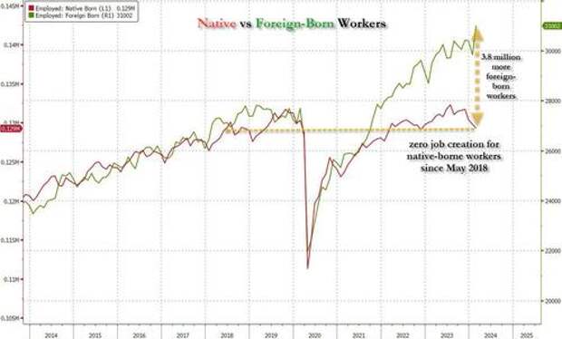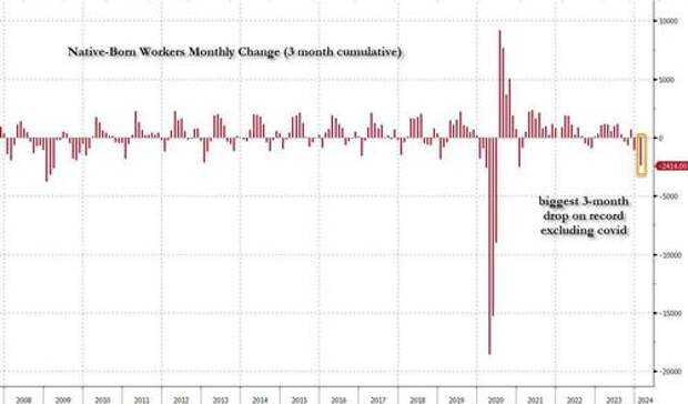 But wait there's even more, because now that the primary season is over and we enter the heart of election season and political talking points will be thrown around left and right, especially in the context of the immigration crisis created intentionally by the Biden administration which is hoping to import millions of new Democratic voters (maybe the US can hold the presidential election in Honduras or Guatemala, after all it is their citizens that will be illegally casting the key votes in November), what we find is that in February, the number of native-born workers tumbled again, sliding by a massive 560K to just 129.807 million. Add to this the December data, and we get a near-record 2.4 million plunge in native-born workers in just the past 3 months (only the covid crash was worse)!