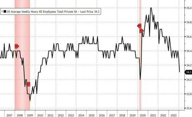 ... for one simple reason: last month's average wage surge had nothing to do with actual wages, and everything to do with the BLS estimate of hours worked (which is the denominator in the average wage calculation) which last month tumbled to just 34.1 (we were led to believe) the lowest since the covid pandemic...