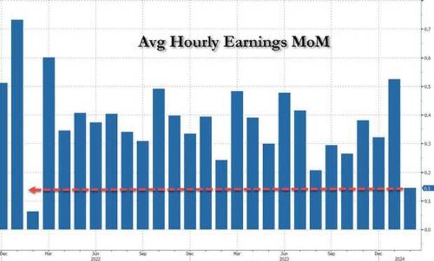 And then there were average hourly earnings, which after surging 0.6% MoM in January (since revised to 0.5%) and spooking markets that wage growth is so hot, the Fed will have no choice but to delay cuts, in February the number tumbled to just 0.1%, the lowest in two years...