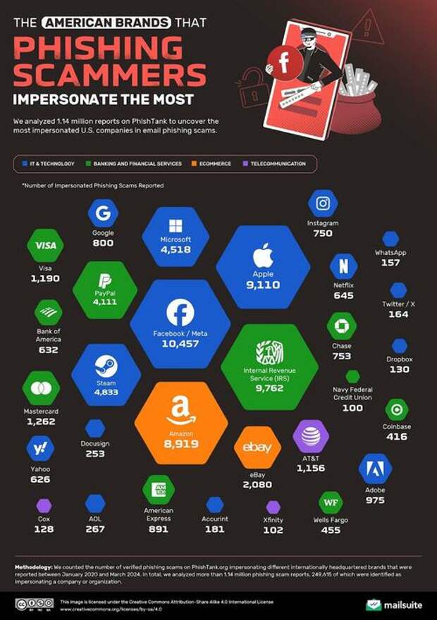 Accounting for all US brands, Facebook’s parent company, Meta, was the most impersonated brand by scammers, appearing in at least 10,457 reported scam incidents during the past four years.