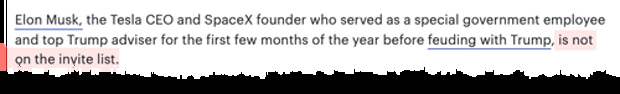 Noticeably absent, according to The Hill, was Elon Musk, whose strained relationship with President Trump earlier this year likely kept him off the guest list.