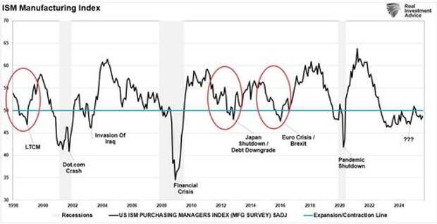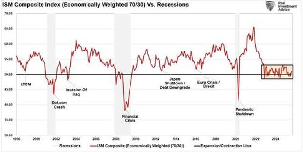 Second, the nature of the economy itself has shifted. The U.S. is far more services-driven today than in past cycles. Manufacturing weakness is notable, but it only represents about 30% of the economy today versus nearly 70% in the 70s. Given that it is a much smaller factor in the economy, it is services that we should focus on, and while weak, they have not been in recessionary territory. The chart below, an economically weighted composite of ISM Services and Manufacturing, shows that recession risks are elevated, but no recession is likely at the moment.