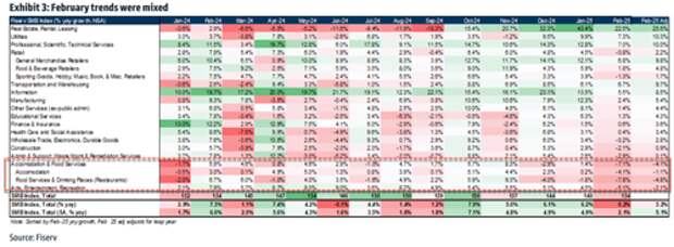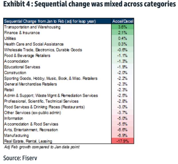 Fiserv's updated Small Business Index for February showed a further slowdown in consumer spending growth compared to January. NSA spending growth was just .2% (vs. 6.2% in January), while SA growth came in at 2.1% (vs. 4.9% prior). Adjusting for the leap year headwinds, NSA growth was a more modest 3.2%, while SA growth remained stable at 5.1%. Transaction growth also slowed to 1.2% NSA. Restaurants continued to show weakness.