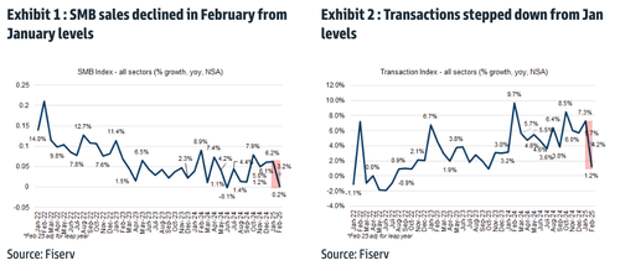 Goldman's Will Nance, Rajul Bothra, and others cited new data from the Fiserv Small Business Index, a monthly indicator measuring small business performance across the US at national, state, and industry levels. Unlike traditional surveys, the index aggregates point-of-sale transaction data—including card, cash, and check transactions—from 2 million small businesses, offering some of the most real-time insights into consumer spending trends.