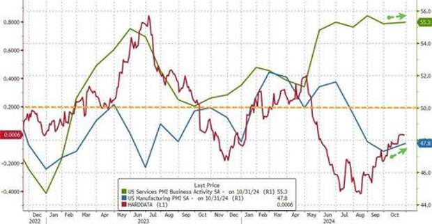 After yesterday's mixed bag of 'soft' survey data from regional Feds (showing prices re-acclerating once again), we get the preliminary October prints form S&P Globals' PMIs this morning with expectations mixed.