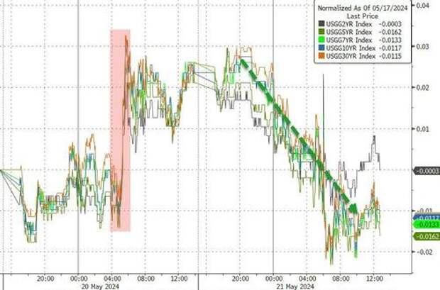 Treasury yields slipped lower today, erasing most of yesterday's spike higher with the short-end lagging (2Y -2bps, 30Y -4bps)...