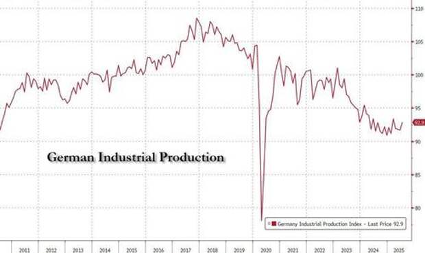 This brings the total production slump since pre-Covid times to over 22 percent. Average capacity utilization has fallen to 80.8 percent - its lowest level in five years. Rising energy-related cost pressures, suffocating regulation, and weakening demand in major export markets such as China and the U.S., also a result of Washington’s tariff policy are pushing output into the basement.