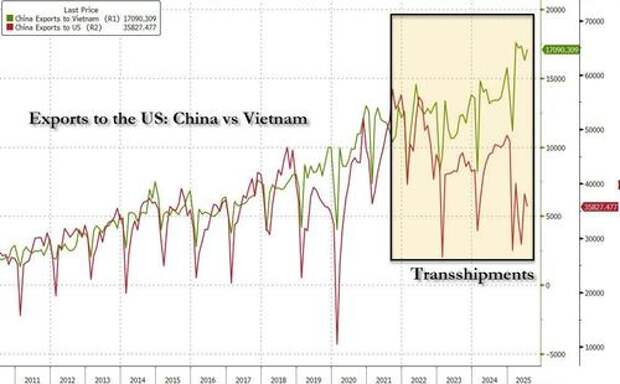 Indeed, for the clearest example of how China is bypassing US tariffs, look no further than Chinese exports to Vietnam - a regional transshipment hub - which then reships the Chinese products onward to the US.