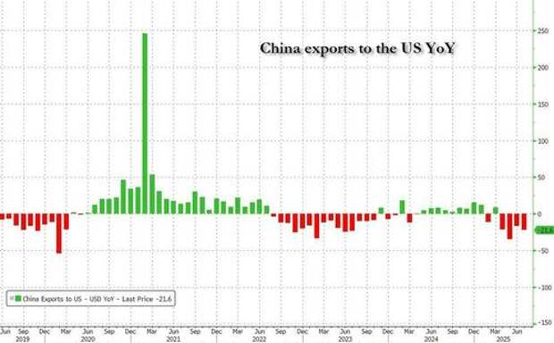 Yet even with the fate of China tariffs still TBD, trade between the two countries has already been hit substantially, and the July figures showed China’s exports to the US declined 22% on a year earlier, after having previously sunk in May by the most since the start of the Covid-19 pandemic.