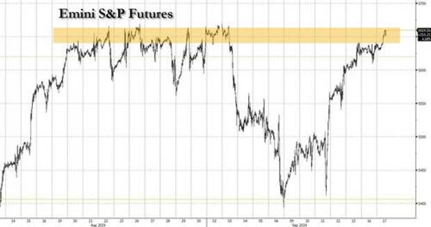 US equity futures gain, and trade just shy of all time highs, led by Tech (especially Mag7 and Semis) as global markets trade higher ahead of the FOMC tomorrow as traders continue to increase probability of 50bps cut (~70% chance now) prompted by another Nick Timiraos WSJ article saying the decision between at 25 vs 50bps rate cut is complicated but withholding a larger cut could raise awkward questions.