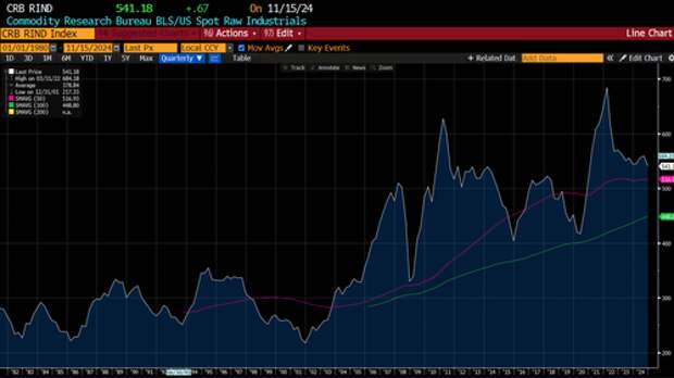 But I can see other ways things go wrong from here. US equities tend to do best when commodity markets are weak to falling. Using the CRB Raw Industrial Index, a spike in commodities bodes ill for US equities.