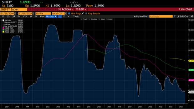 The key here is that China has so far restrained from stimulus. Using the 12mth Shanghai Interbank Rate which has high correlation to activity, China remains in a funk.