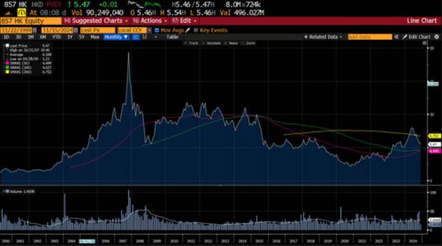 In 2003, Warren Buffett bought 7% of Petrochina, and then slowly began exiting in 2007. The final spike happened after Berkshire Hathaway had sold out fully, and the market believed the overhang was gone. Markets were getting very bullish on emerging markets as the Federal Reserve was beginning to cut interest rates as this was seen as the catalyst for emerging markets in 2002.