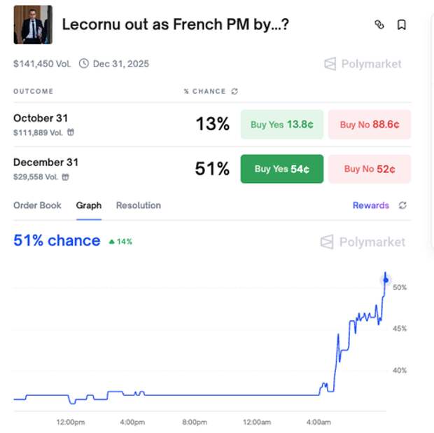 Odds on the cryptocurrency-based prediction market Polymarket show 13% that Lecornu is out by the end of next week. About 12 hours ago, these odds were 4%. Odds for Lecornu's ouster by the end of the year jumped from 37% to as high as 51% on Friday.