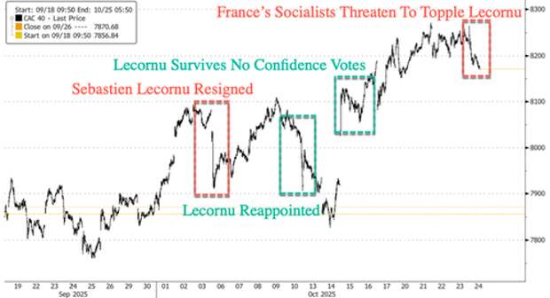 Bloomberg noted, "The threats from the Socialist party chief come as the group treads a tricky line between getting more out of Lecornu on fiscal plans while avoiding fresh elections. The ouster of yet another premier would likely result in a snap legislative vote, in which polls suggest Socialists would fare poorly."